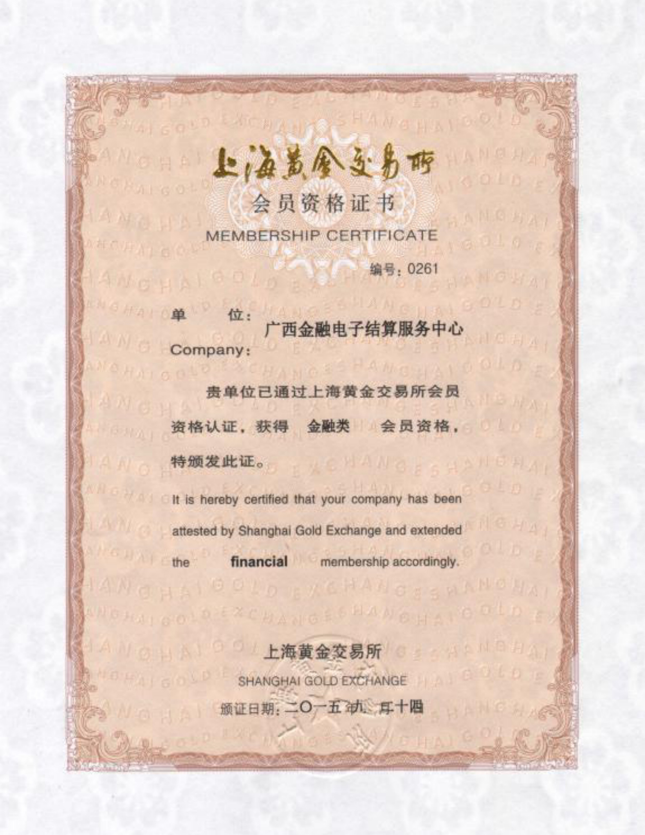 廣西金融電子結(jié)算服務(wù)中心金融類會員資格證書